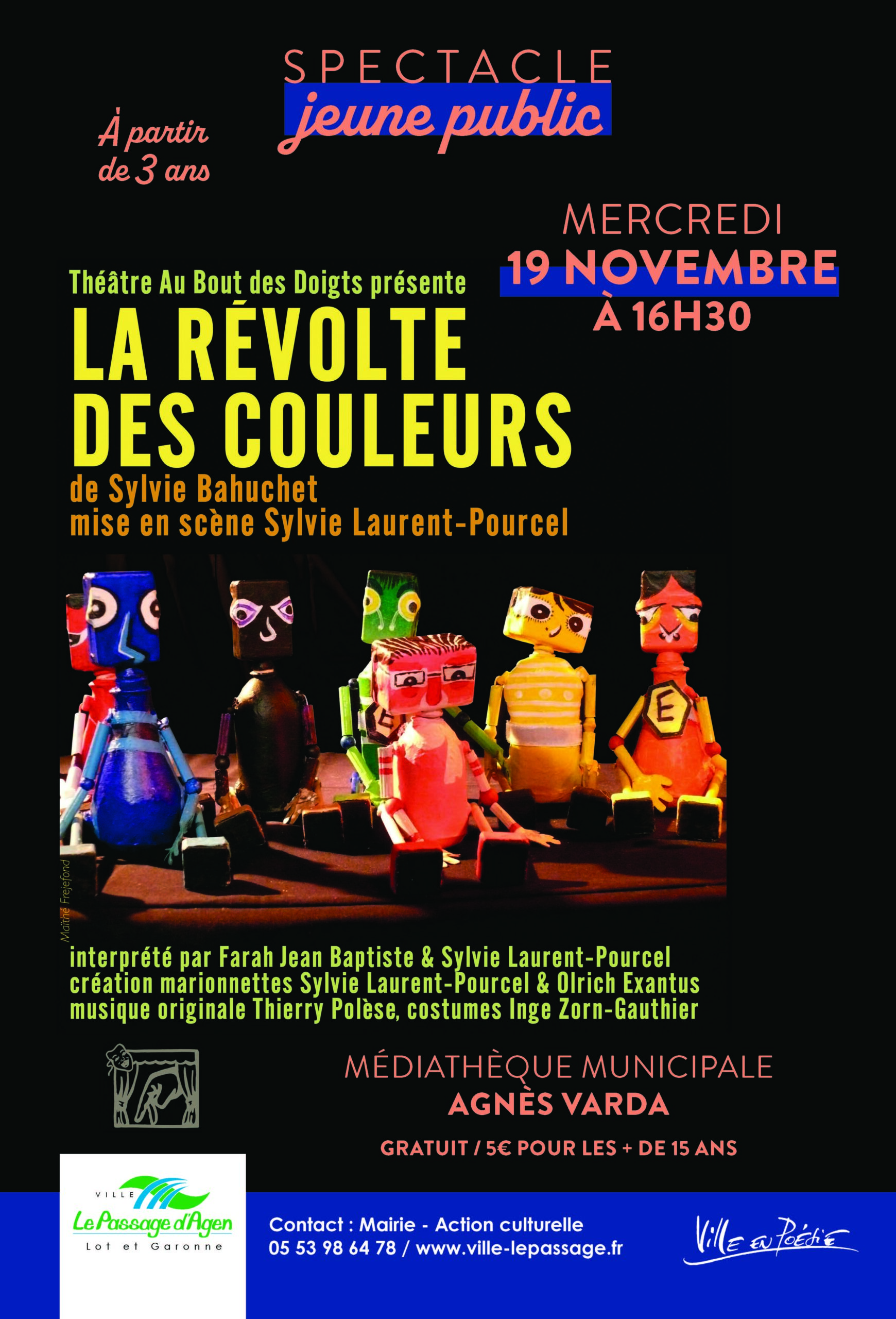 Le Service Action culturelle de la Ville vous propose un spectacle jeune public “La Révolte des couleurs”, le mercredi 19 novembre à 16h30, à la Médiathèque Municipale Agnès Varda.