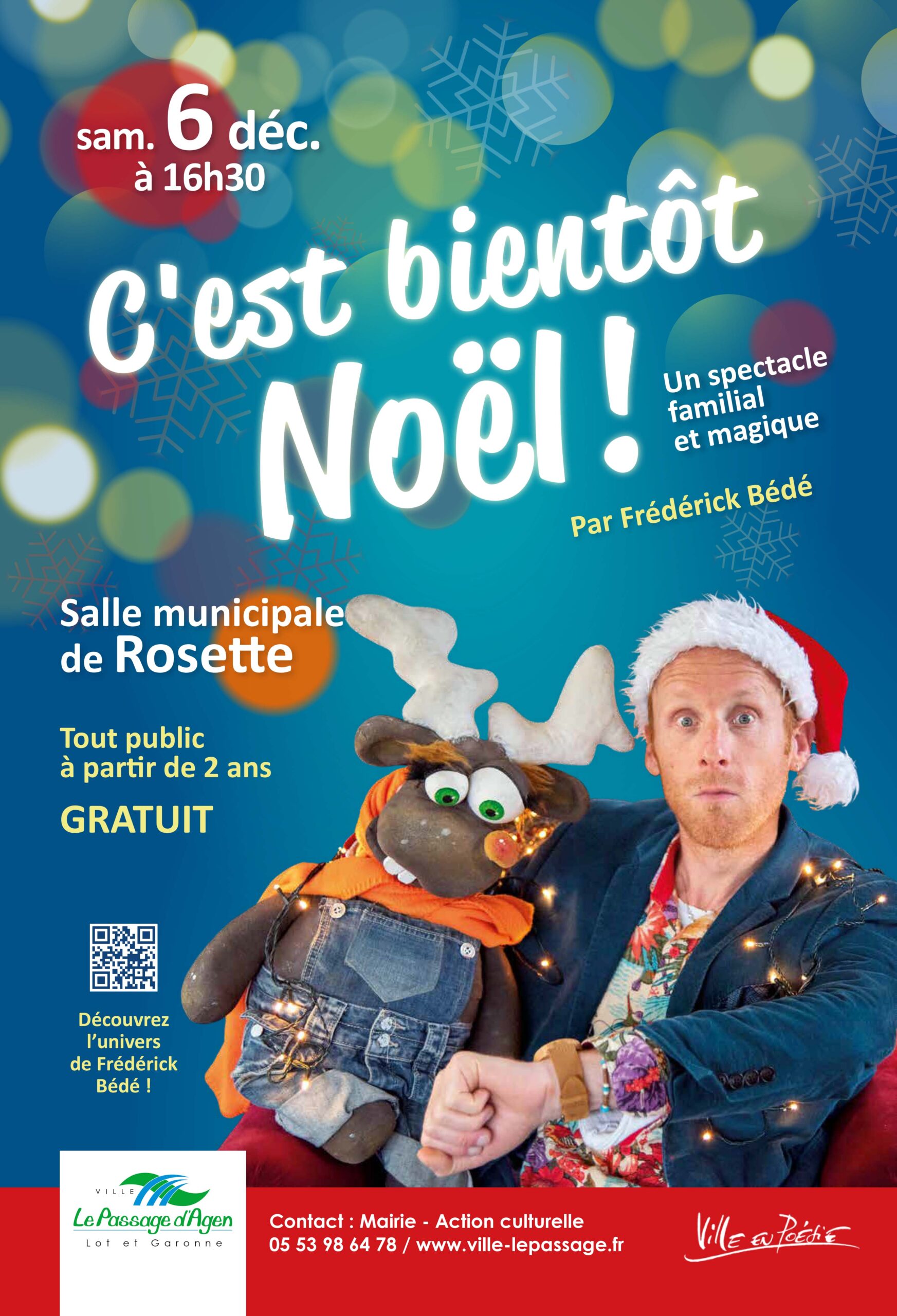 Le Service Action culturelle de la Ville vous invite à son spectacle de Noël “C’est bientôt Noël !”, le samedi 6 décembre à 16h30, à la salle Municipale de Rosette.